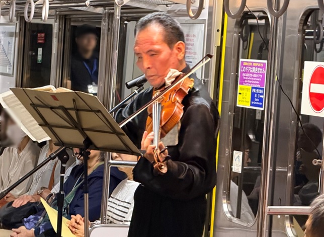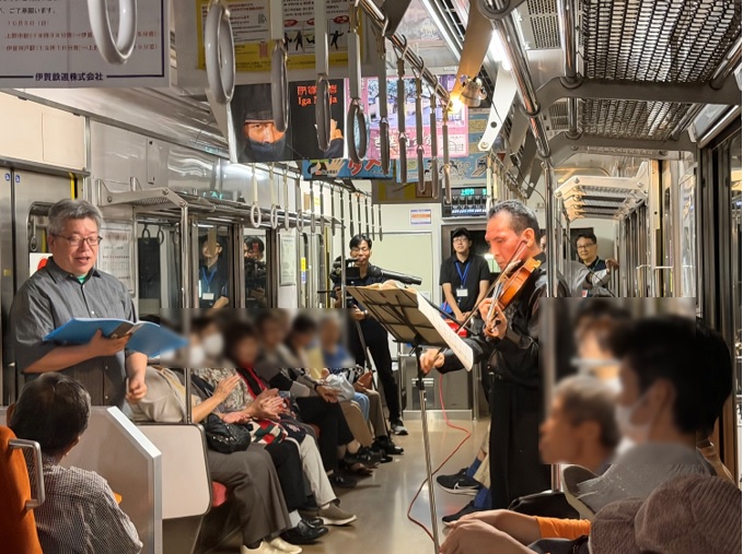 しかし、上野市駅出発前に「お月見だんご」と「お月見パン」をお配りし、出発後すぐにヴァイオリンの演奏とバスの独唱が始まると、一気に「お月見ムード」が盛り上がりました!