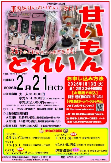 伊賀鉄道沿線の菓子店と、地元の高等学校とタイアップし、車内にて「甘いもん(スイーツ)」を召し上がっていただく『甘いもんとれいん』を、午前と午後の2便運転します。
