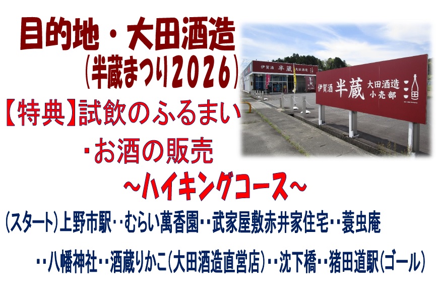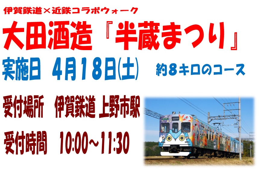 ホーム ニュース 4/18(土)伊賀鉄×近鉄コラボウォーク 大田酒造『半蔵まつり』開催! 4/18(土)伊賀鉄×近鉄コラボウォーク 大田酒造『半蔵まつり』開催! 2026年4月18日(土)に伊賀市上之庄にある大田酒造直営店で『半蔵まつり』が行われます。 それに合わせ伊賀鉄道では、近鉄とのコラボウォークを実施します。スタートは上野市駅、ゴールは猪田道駅の約8キロのッコースです。大田酒造では”試飲”のふるまいもあります。予約も不要ですので、お気軽にご参加ください! 戻る