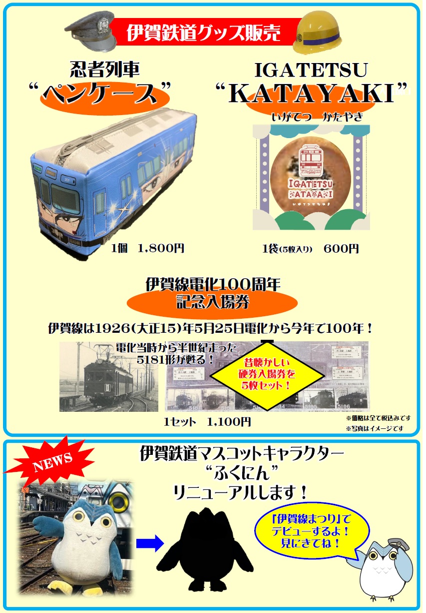 伊賀鉄道グッズコーナーでは新グッズとして、忍者列車デザインの「ペンケース」や、伊賀の特産品の“かたやき”が入った「IGATETSU KATAYAKI」のほか、今年が伊賀線電化100周年になるのを記念し「伊賀線電化100周年記念入場券セット」を販売します。